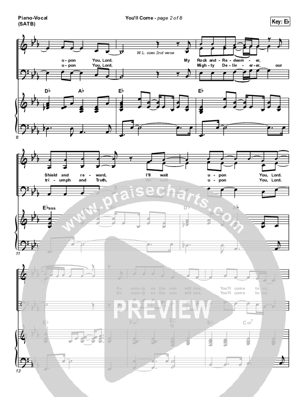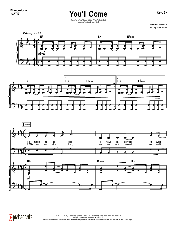 Download the sheet music for You'll Come by Hillsong Worship, from the album This Is Our God. This song was arranged by Joel Mott in the key of E, Eb, F.