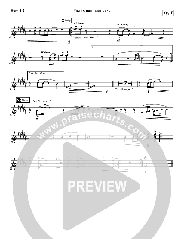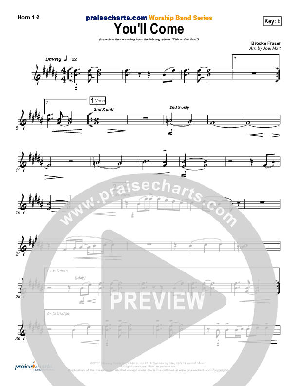 Download the French Horn sheet music for You'll Come by Hillsong Worship, from the album This Is Our God. This song was arranged by Joel Mott in the key of E, Eb, F.
