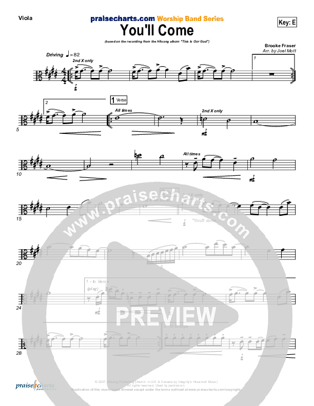 Download the Viola sheet music for You'll Come by Hillsong Worship, from the album This Is Our God. This song was arranged by Joel Mott in the key of E, Eb, F.