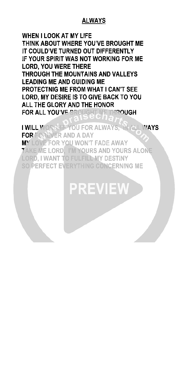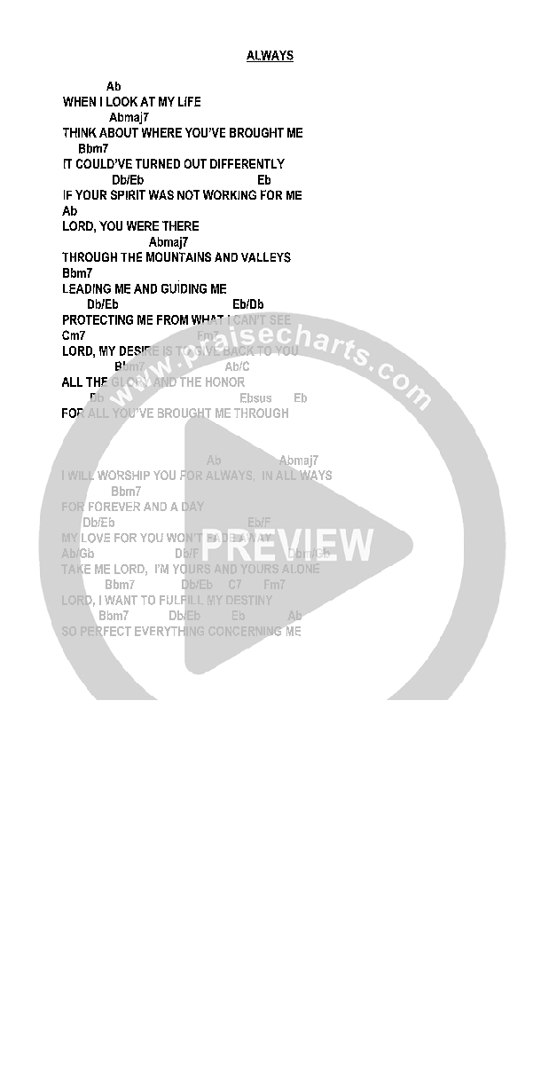 Download the PDF Chord Charts for Always by Heath Jarvis, from the album Just You And Me. This song was arranged by Heath Jarvis in the key of Ab.