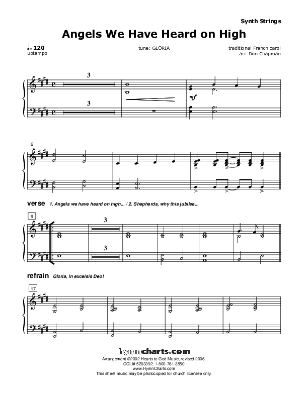 Download the Orchestration for Angels We Have Heard On High by Don Chapman, from the album Christmas Hymncharts. This song was arranged by Don Chapman in the key of E.