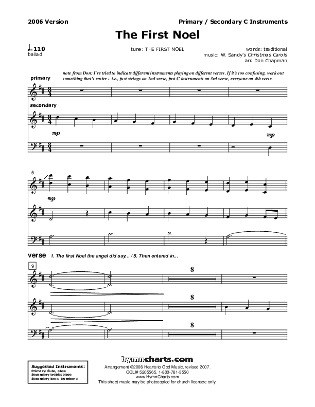 Download the Orchestration for The First Noel by Don Chapman, from the album Christmas Hymncharts. This song was arranged by Don Chapman in the key of D.