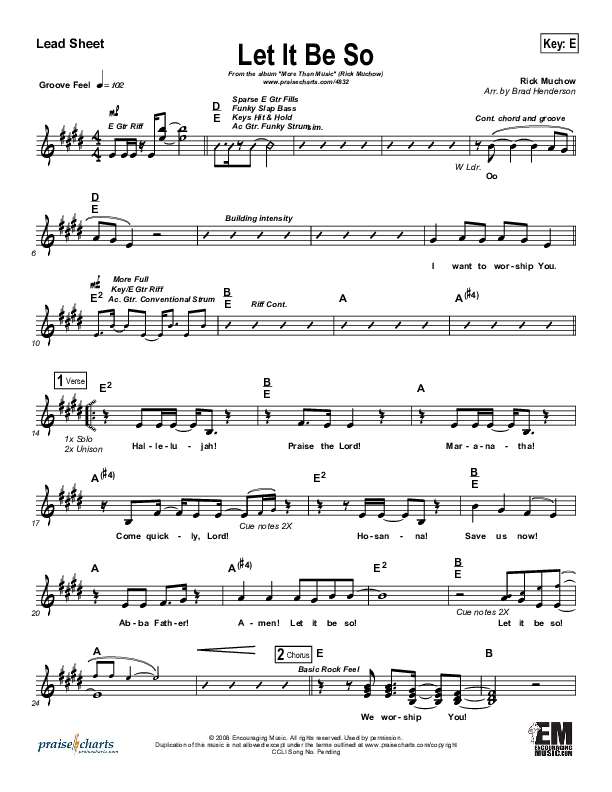 Download the sheet music for Let It Be So by Rick Muchow, from the album More Than Music. This song was arranged by Brad Henderson in the key of E, Eb.