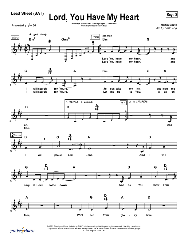 Download the sheet music for Lord You Have My Heart by Delirious, from the album Cutting Edge. This song was arranged by Kevin Eng in the key of D, E, Eb.