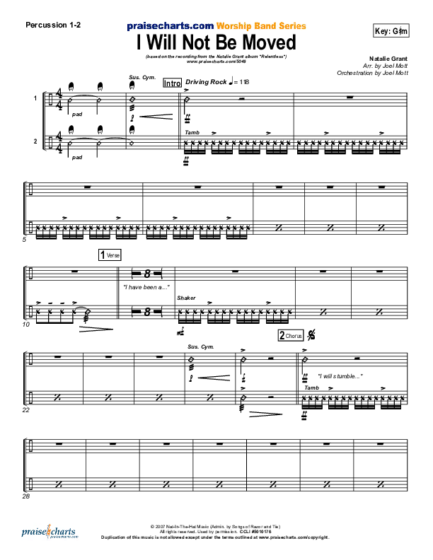 Download the Orchestration for I Will Not Be Moved by Natalie Grant, from the album Relentless. This song was arranged by Joel Mott in the key of G#m, Gm.