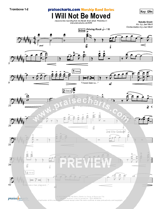 Download the Trombone 1,2 sheet music for I Will Not Be Moved by Natalie Grant, from the album Relentless. This song was arranged by Joel Mott in the key of G#m, Gm.