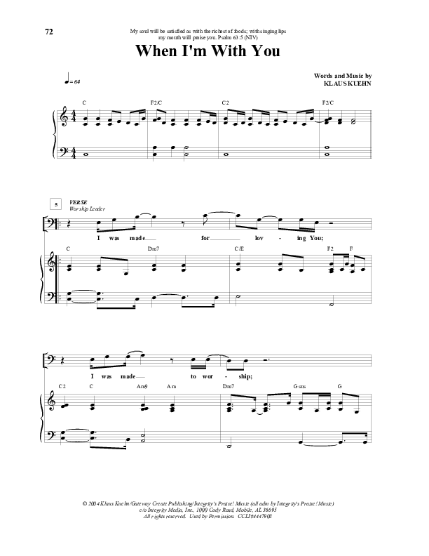 Download the sheet music for When I'm With You by Klaus, from the album Glory. This song was arranged by Integrity Music in the key of C.