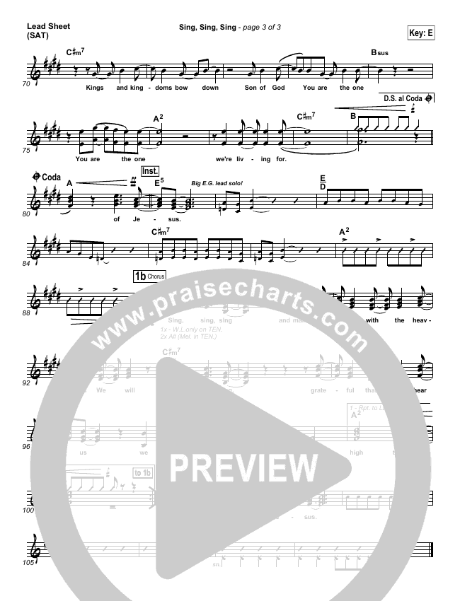 Download the sheet music for Sing Sing Sing by Chris Tomlin, from the album Hello Love. This song was arranged by Daniel Galbraith in the key of D, E.