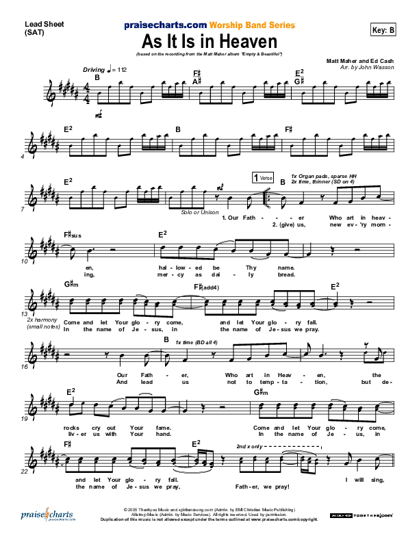 Download the Orchestration for As It Is In Heaven by Matt Maher, from the album Empty And Beautiful. This song was arranged by John Wasson in the key of B, Bb.