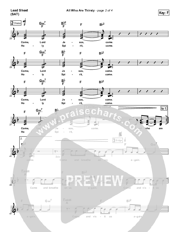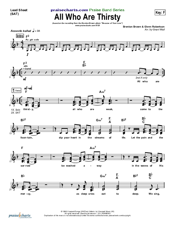 Download the sheet music for All Who Are Thirsty by Brenton Brown, from the album Because of Your Love. This song was arranged by Grant Wall in the key of F, G.