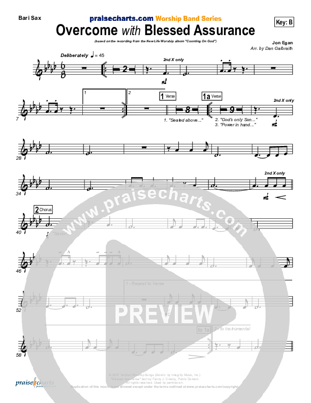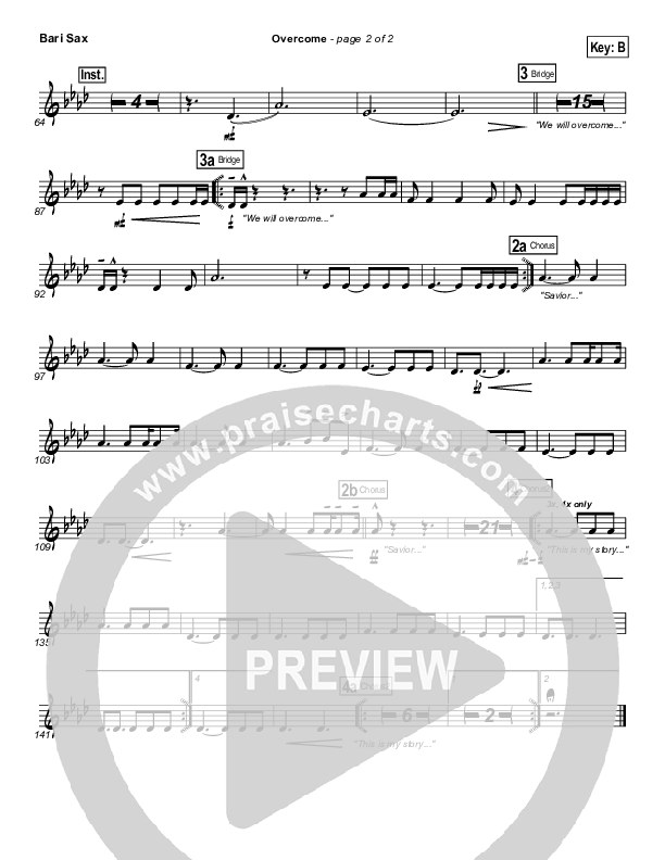 Download the Bari Sax sheet music for Overcome by New Life Worship, from the album Counting On God. This song was arranged by Daniel Galbraith in the key of B, Bb.