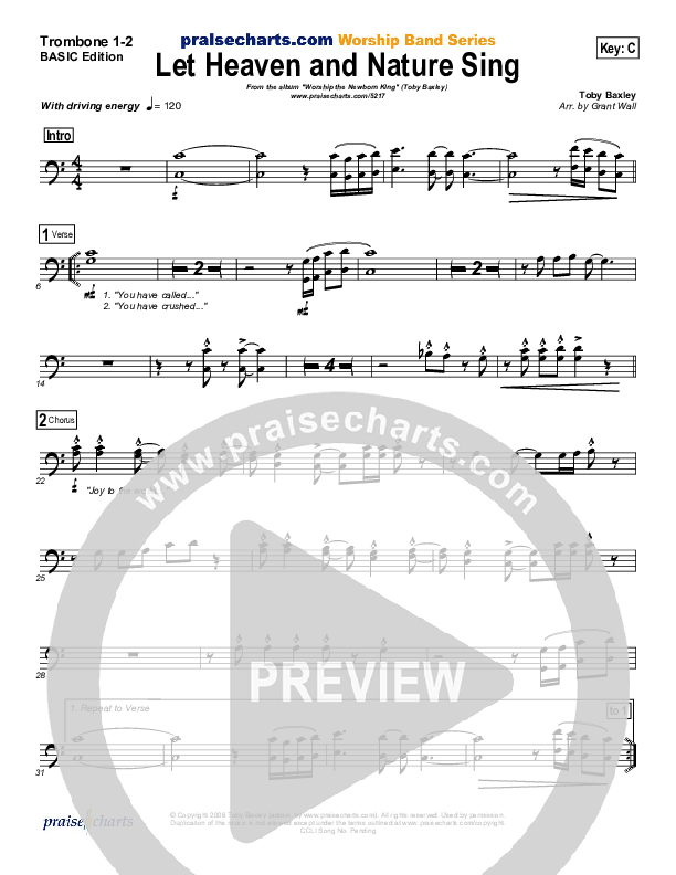 Download the Trombone 1,2 sheet music for Let Heaven and Nature Sing, from the album Worship The Newborn King. This song was arranged by Grant Wall in the key of C, D.