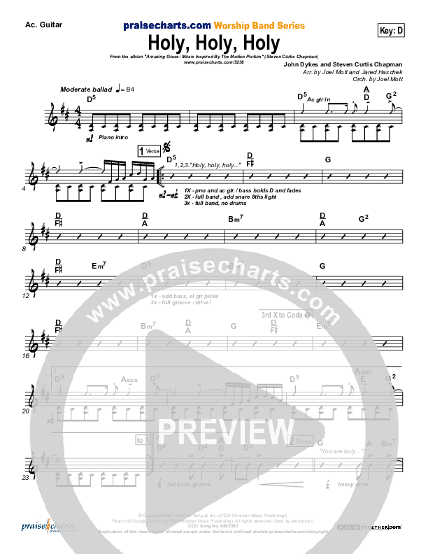 Download the Rhythm Chart for Holy Holy Holy by Steven Curtis Chapman, from the album Amazing Grace: Music Inspired By The Motion Picture. This song was arranged by Joel Mott / Jared Haschek in the key of C, D.