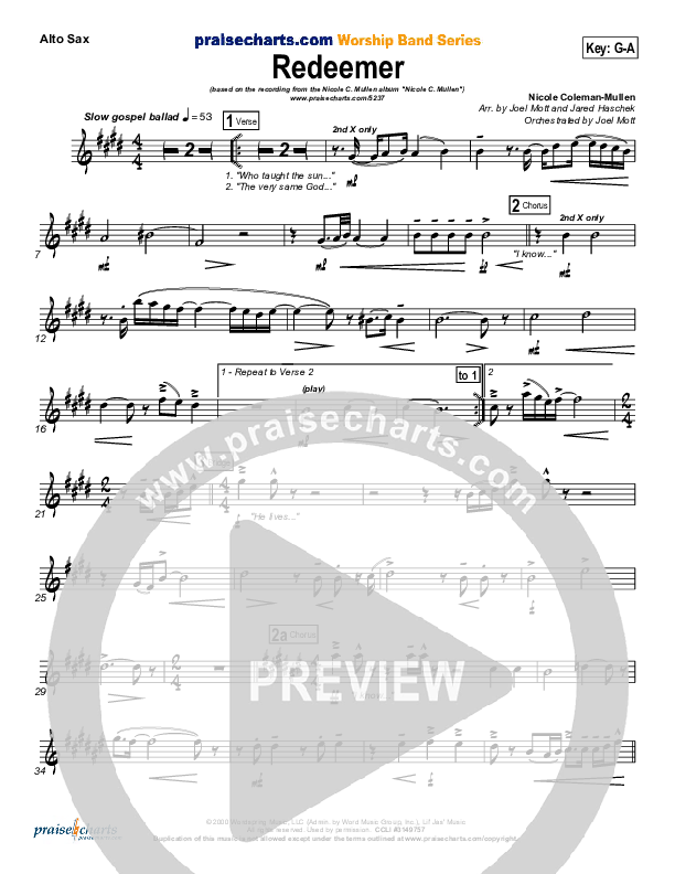 Download the AltoSax sheet music for Redeemer by Nicole C. Mullen, from the album Nicole C. Mullen. This song was arranged by Joel Mott / Jared Haschek in the key of Ab, G.