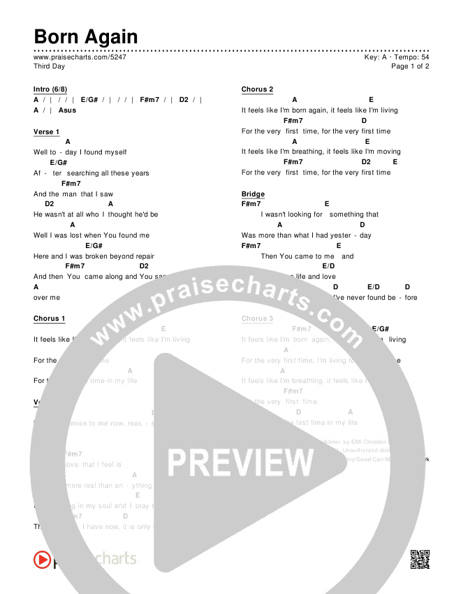 Download the PDF Chord Charts for Born Again by Third Day, from the album Revelation. This song was arranged by Shane Ohlson / Erik Foster in the key of A, G.