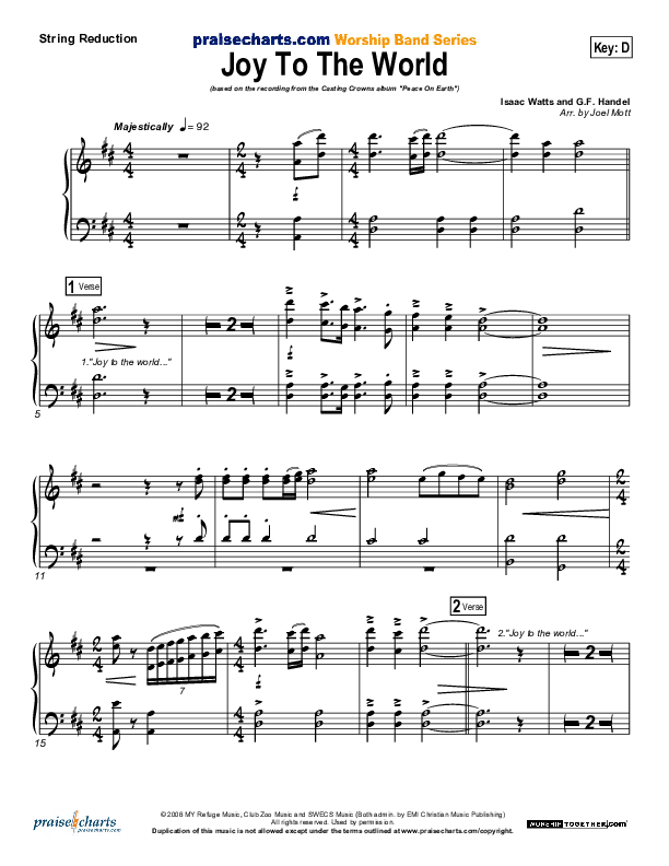 Download the Orchestration for Joy To The World by Casting Crowns, from the album Peace On Earth. This song was arranged by Joel Mott in the key of C, D.