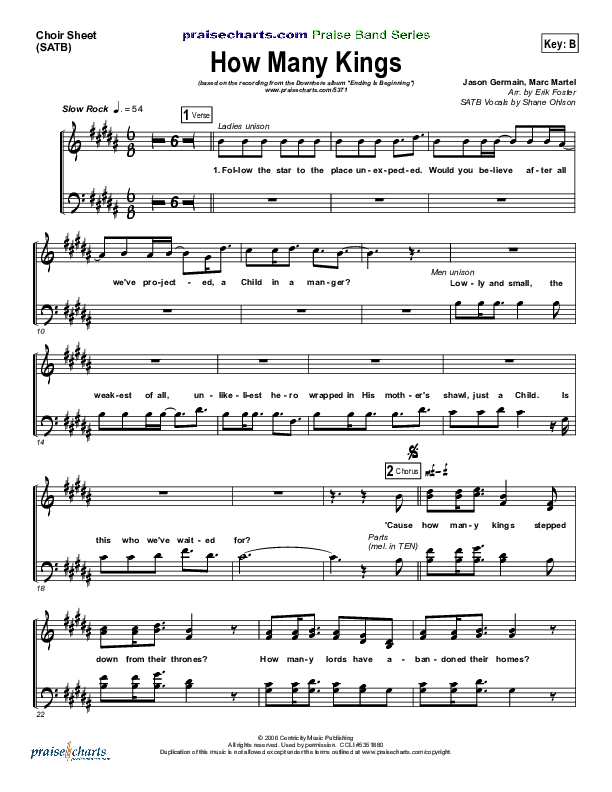 Download the Choir Sheet for How Many Kings by Downhere, from the album Ending Is Beginning. This song was arranged by Erik Foster in the key of B, Bb, G.