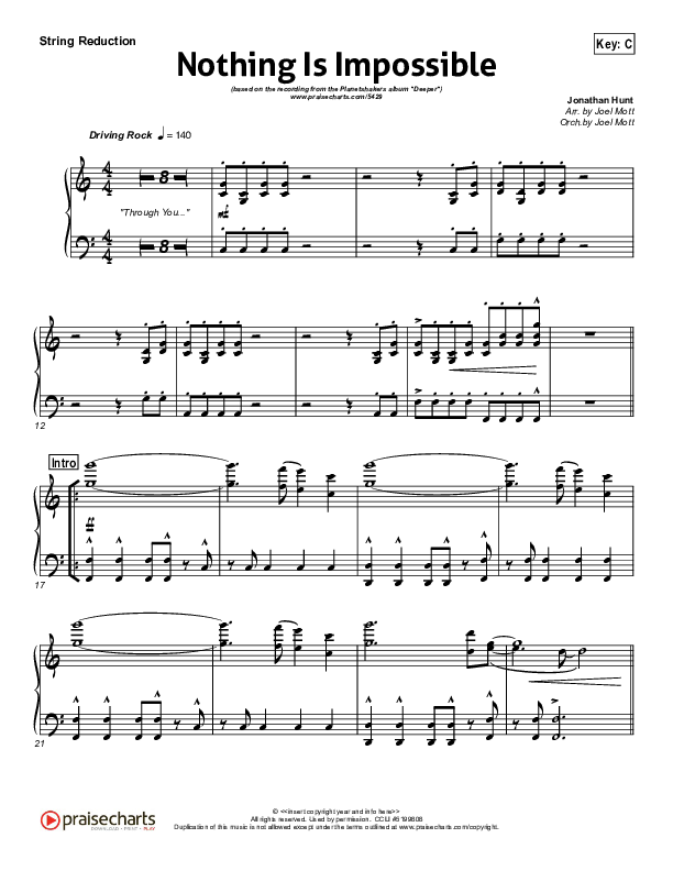 Download the Orchestration for Nothing Is Impossible by Planetshakers, from the album Deeper. This song was arranged by Joel Mott in the key of Bb, C.
