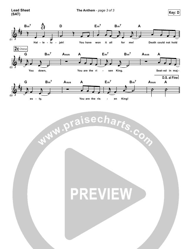 Download the sheet music for The Anthem by Planetshakers, from the album All For Love. This song was arranged by Daniel Galbraith in the key of C, D.