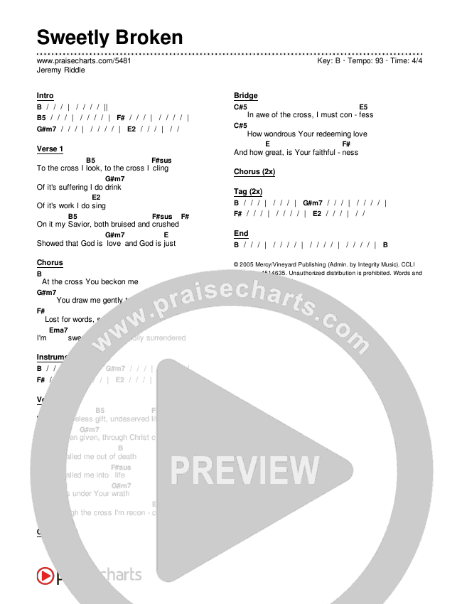 Download the PDF Chord Charts for Sweetly Broken by Jeremy Riddle, from the album Full Attention. This song was arranged by Joel Mott / Kevin Eng in the key of B, Bb.