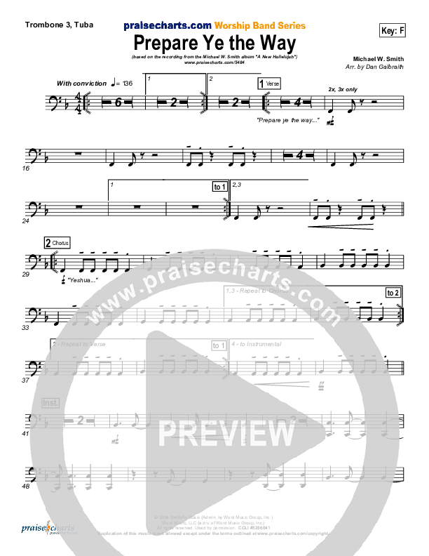 Download the Trombone 3/Tuba sheet music for Prepare Ye The Way by Michael W. Smith, from the album A New Hallelujah. This song was arranged by Daniel Galbraith in the key of D.