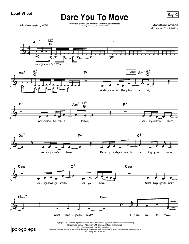 Download the sheet music for I Dare You To Move by Switchfoot, from the album Beautiful Let Down. This song was arranged by Jared Haschek in the key of C, E.