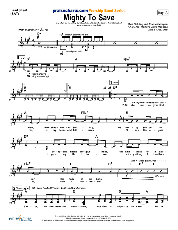 Download the Orchestration for Mighty To Save (Digital Edit) by Michael W. Smith, from the album A New Hallelujah. This song was arranged by Joel Mott / Jared Haschek in the key of A, G.