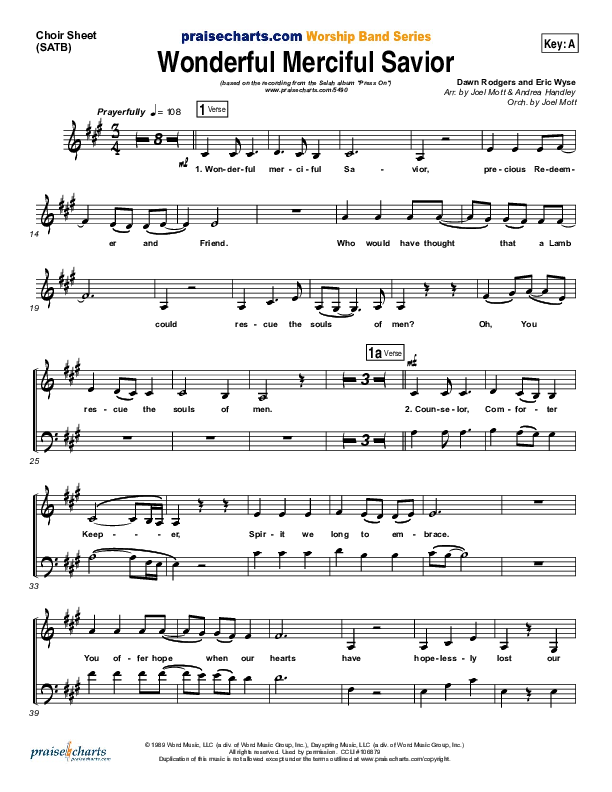 Download the Choir Sheet for Wonderful Merciful Savior by Selah, from the album Press On. This song was arranged by Andrea Handley / Joel Mott in the key of A, Bb, C, G.
