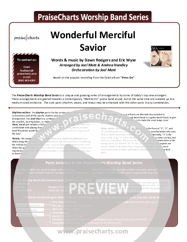 Download the Orchestration for Wonderful Merciful Savior by Selah, from the album Press On. This song was arranged by Andrea Handley / Joel Mott in the key of A, Bb, C, G.
