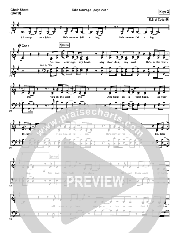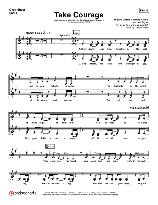 Download the Choir Sheet for Take Courage by Bethel Music, from the album Starlight. This song was arranged by Ed Kerr / Daniel Galbraith in the key of Ab, G.
