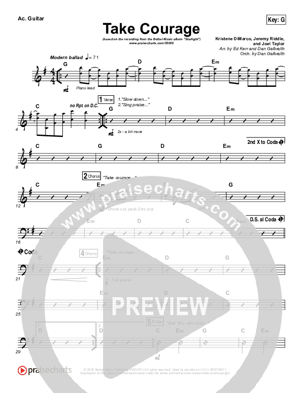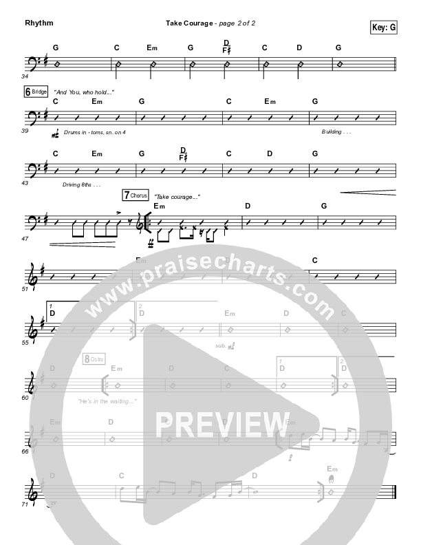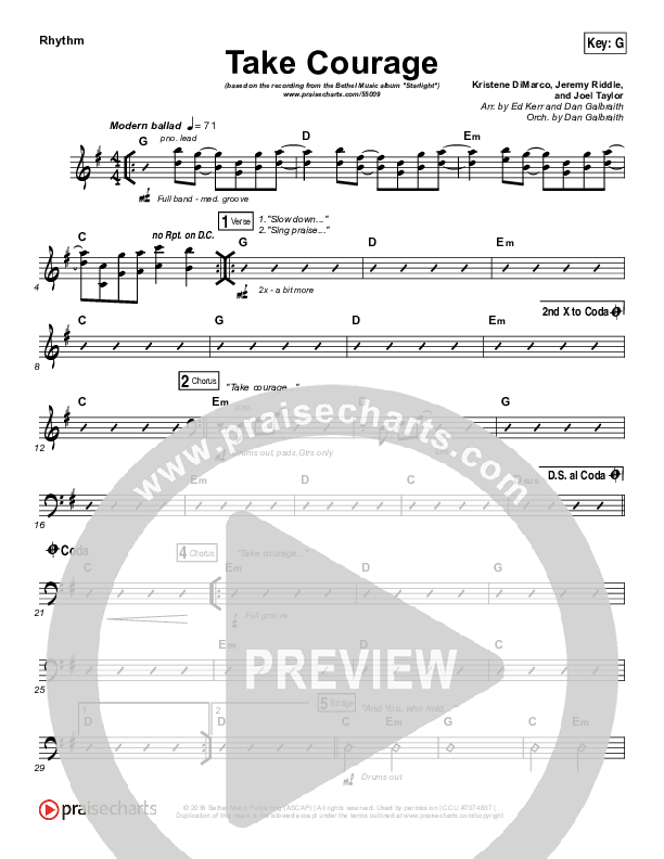 Download the Rhythm Chart for Take Courage by Bethel Music, from the album Starlight. This song was arranged by Ed Kerr / Daniel Galbraith in the key of Ab, G.