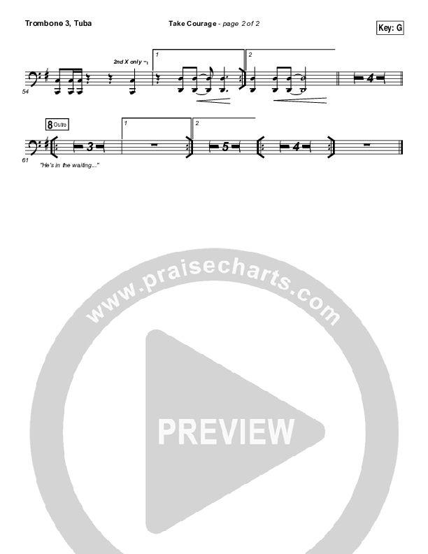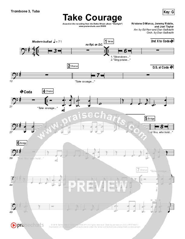 Download the Trombone 3/Tuba sheet music for Take Courage by Bethel Music, from the album Starlight. This song was arranged by Ed Kerr / Daniel Galbraith in the key of Ab, G.