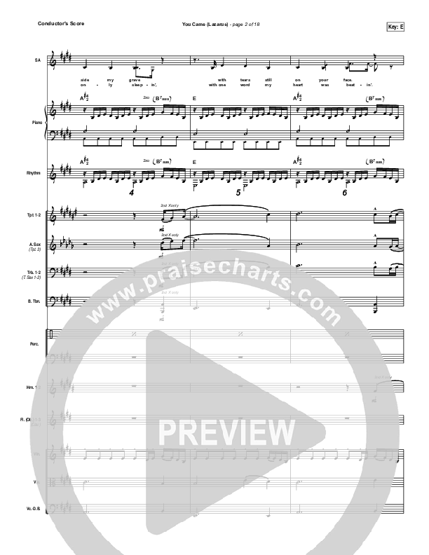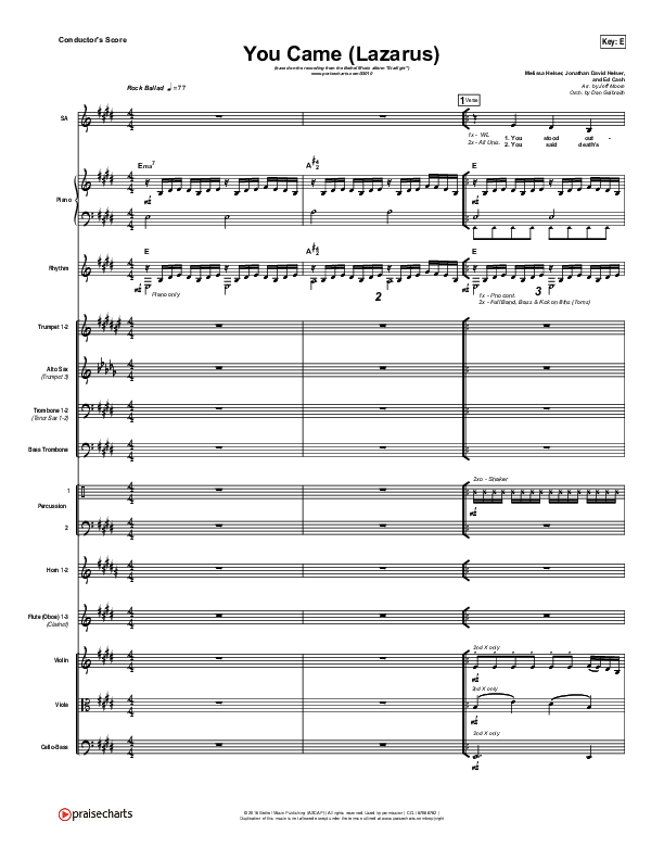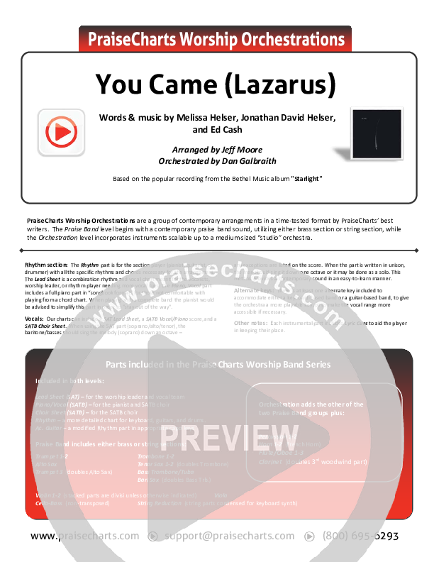 Download the Orchestration for You Came (Lazarus) by Bethel Music / Melissa Helser, from the album Starlight. This song was arranged by Jeff Moore / Daniel Galbraith in the key of C, E, F.