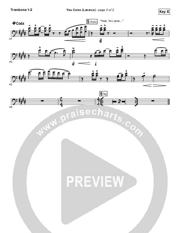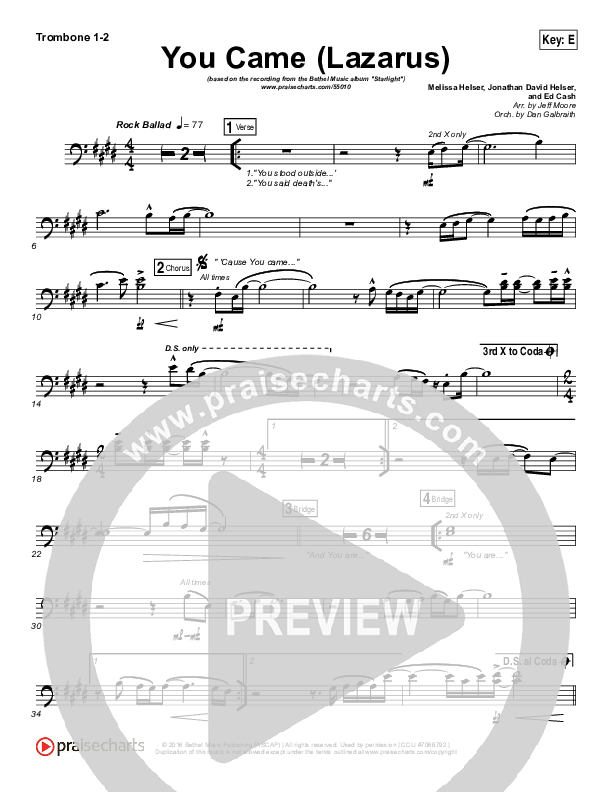 Download the Trombone 1,2 sheet music for You Came (Lazarus) by Bethel Music / Melissa Helser, from the album Starlight. This song was arranged by Jeff Moore / Daniel Galbraith in the key of C, E, F.