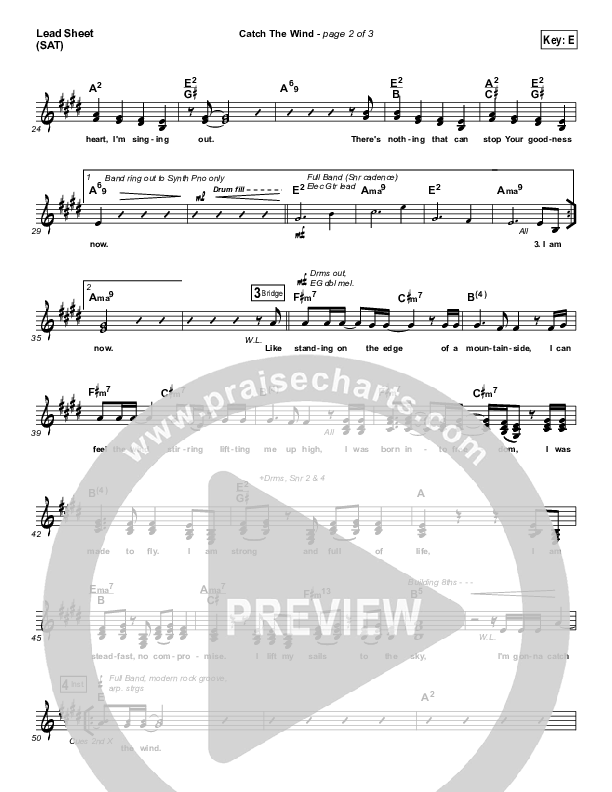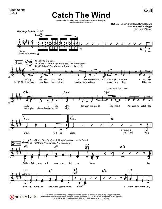 Download the sheet music for Catch The Wind by Bethel Music / Melissa Helser, from the album Starlight. This song was arranged by Jeff Moore in the key of E, F.