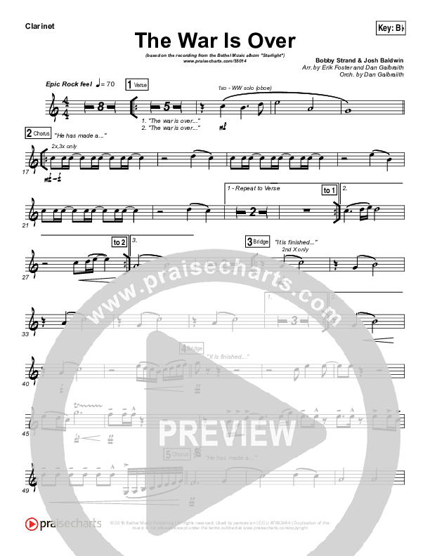 Download the Orchestration for The War Is Over by Bethel Music, from the album Starlight. This song was arranged by Erik Foster / Daniel Galbraith in the key of Bb, C.