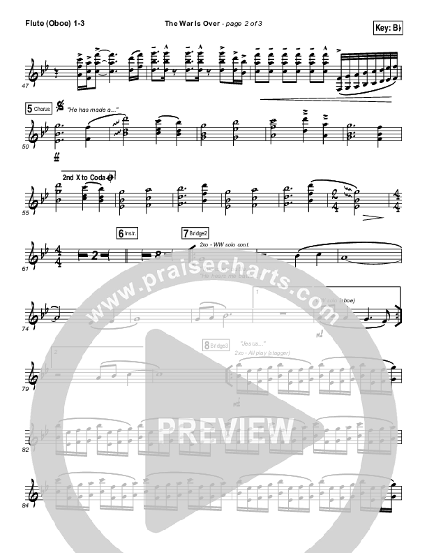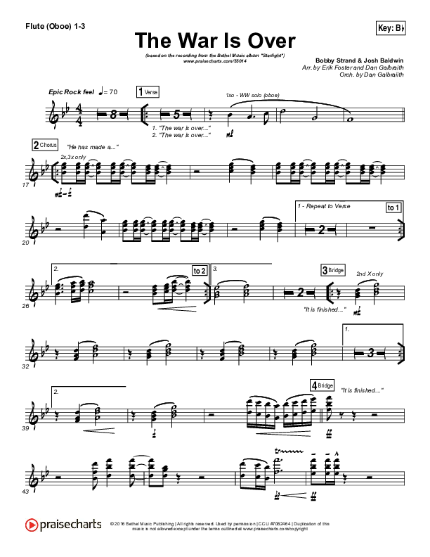 Download the Flute/Oboe sheet music for The War Is Over by Bethel Music, from the album Starlight. This song was arranged by Erik Foster / Daniel Galbraith in the key of Bb, C.