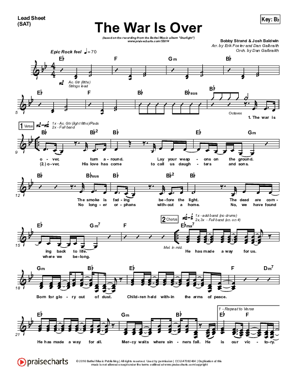Download the sheet music for The War Is Over by Bethel Music, from the album Starlight. This song was arranged by Erik Foster / Daniel Galbraith in the key of Bb, C.
