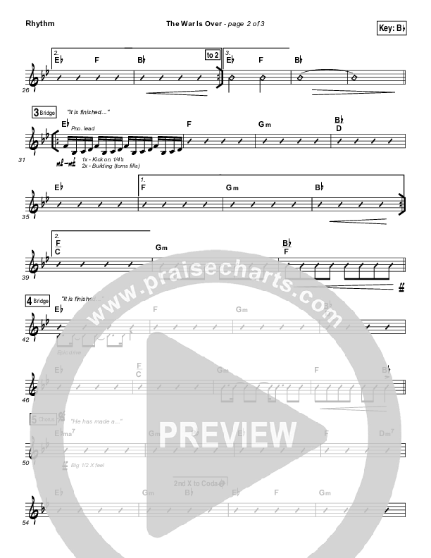 Download the Rhythm Chart for The War Is Over by Bethel Music, from the album Starlight. This song was arranged by Erik Foster / Daniel Galbraith in the key of Bb, C.