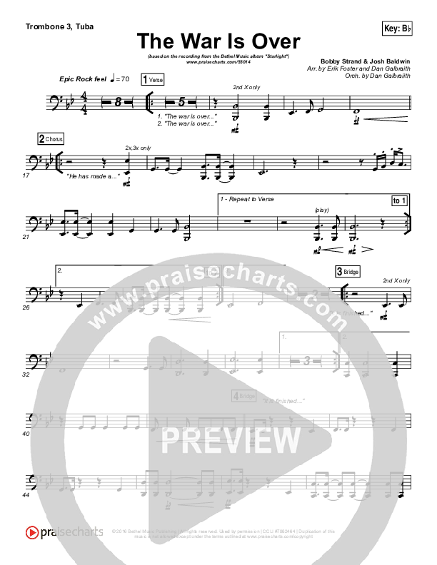 Download the Trombone 3/Tuba sheet music for The War Is Over by Bethel Music, from the album Starlight. This song was arranged by Erik Foster / Daniel Galbraith in the key of Bb, C.