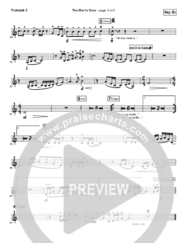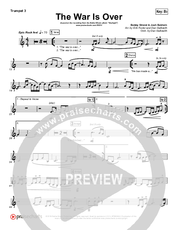 Download the Trumpet 3 sheet music for The War Is Over by Bethel Music, from the album Starlight. This song was arranged by Erik Foster / Daniel Galbraith in the key of Bb, C.