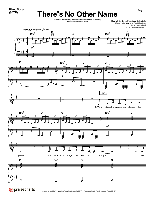 Download the sheet music for There's No Other Name by Bethel Music / Francesca Battistelli, from the album Starlight. This song was arranged by Grant Wall / Daniel Galbraith in the key of A, Ab, G.