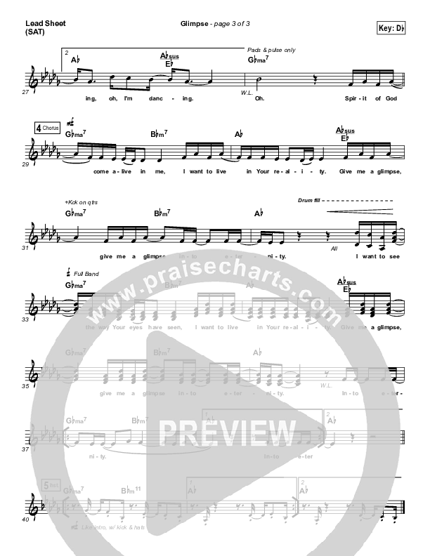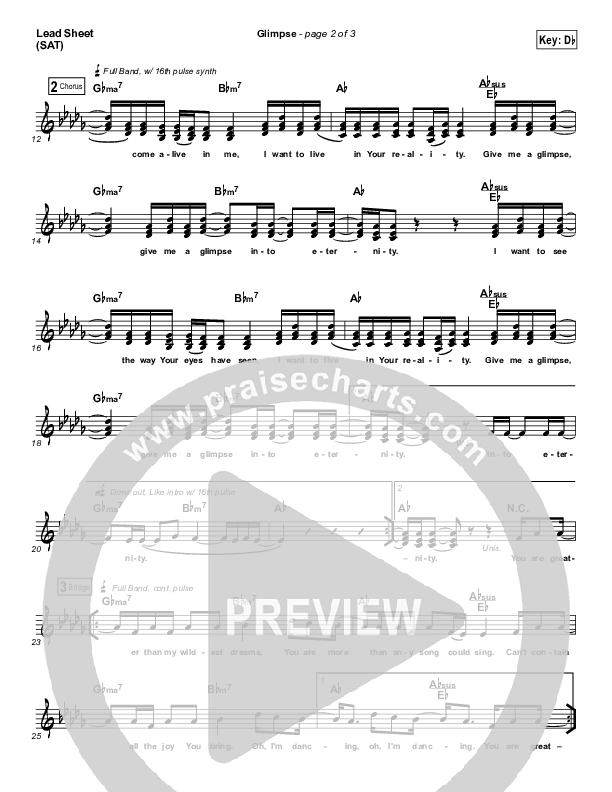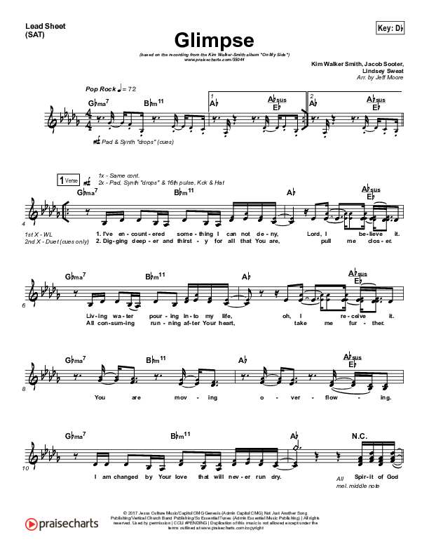 Download the sheet music for Glimpse by Kim Walker-Smith, from the album On My Side. This song was arranged by Jeff Moore in the key of C, Db.