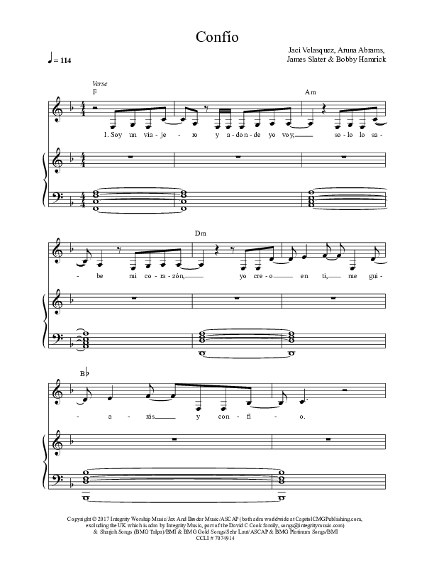 Download the sheet music for Confio by Jaci Velasquez, from the album Confio. This song was arranged by Integrity Music in the key of F.