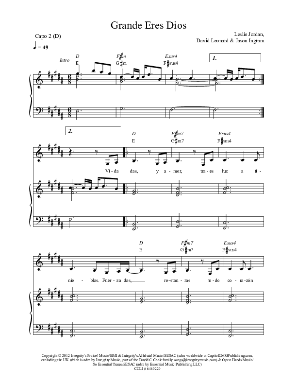 Download the sheet music for Grande Eres Dios (Great Are You Lord) by Jaci Velasquez / Nic Gonzales, from the album Confio. This song was arranged by Integrity Music in the key of B.