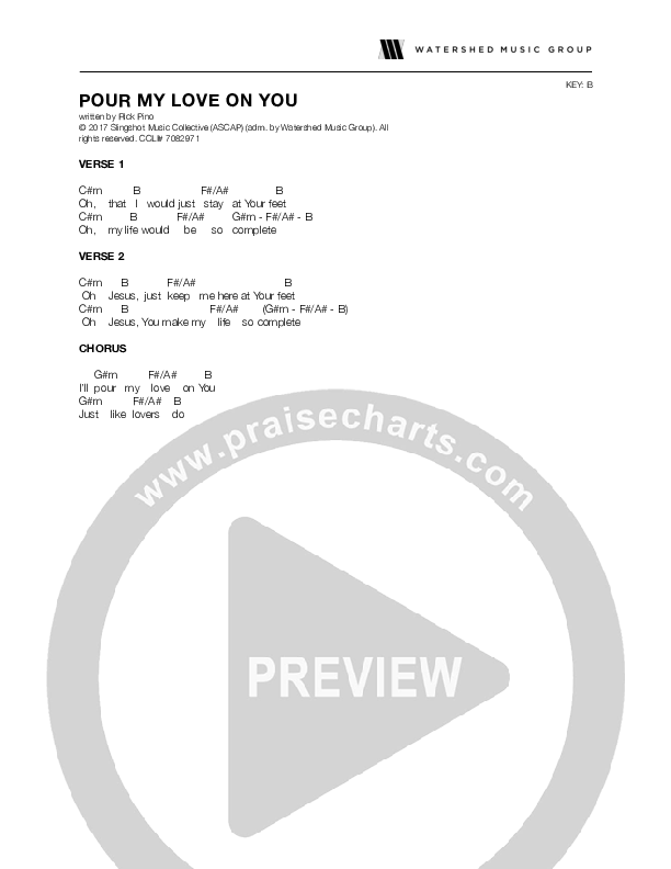 Download the PDF Chord Charts for Pour My Love On You by Rick Pino, from the album Rend The Heavens (Live). This song was arranged by Watershed Music Group in the key of B.