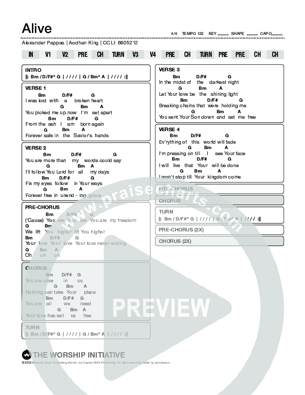 Download the PDF Chord Charts for Alive by The Worship Initiative, from the album The Worship Initiative Volume 12. This song was arranged by WI Charts in the key of D.