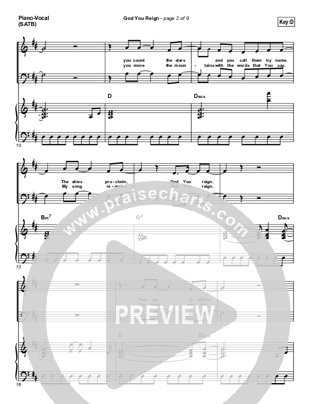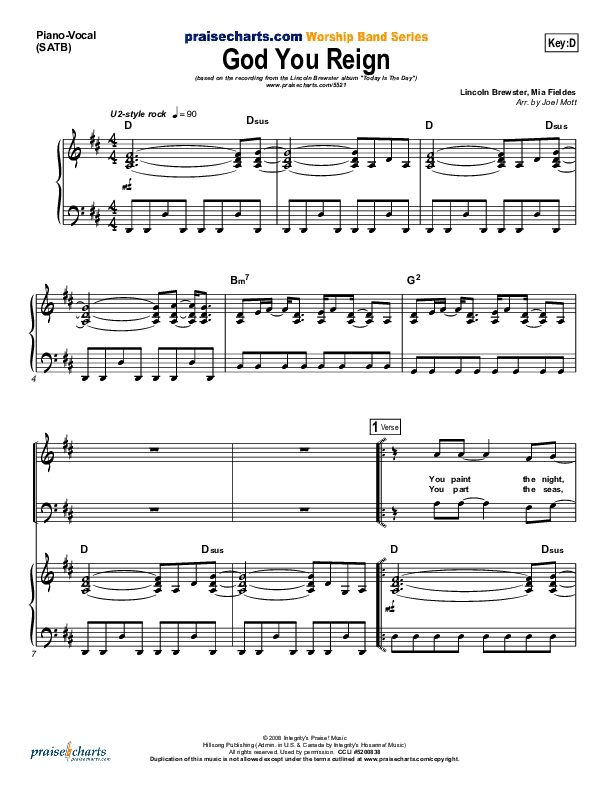 Download the sheet music for God You Reign by Lincoln Brewster, from the album Today Is The Day. This song was arranged by Joel Mott in the key of C, D.