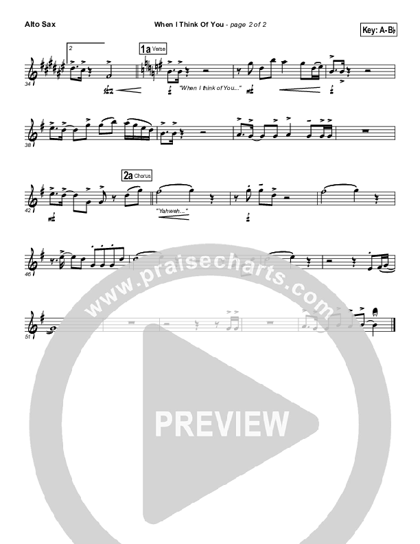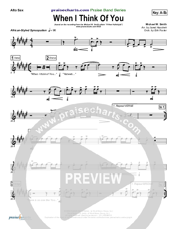 Download the AltoSax sheet music for When I Think Of You by Michael W. Smith, from the album A New Hallelujah. This song was arranged by Erik Foster in the key of A, E.