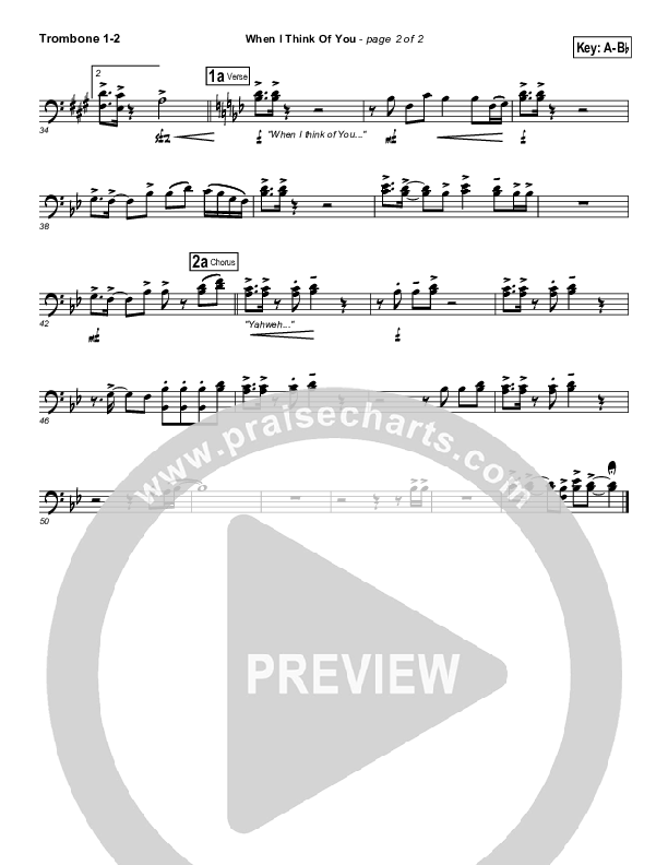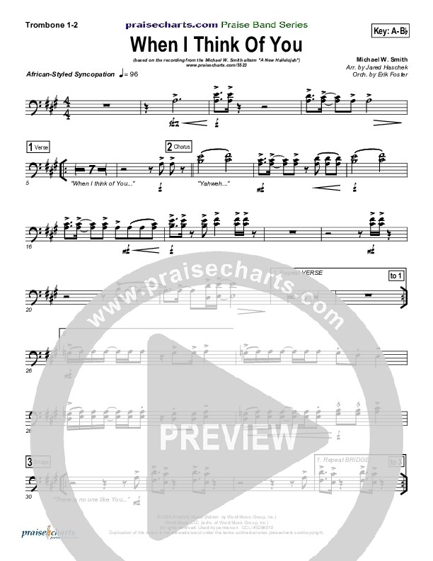 Download the Trombone 1,2 sheet music for When I Think Of You by Michael W. Smith, from the album A New Hallelujah. This song was arranged by Erik Foster in the key of A, E.